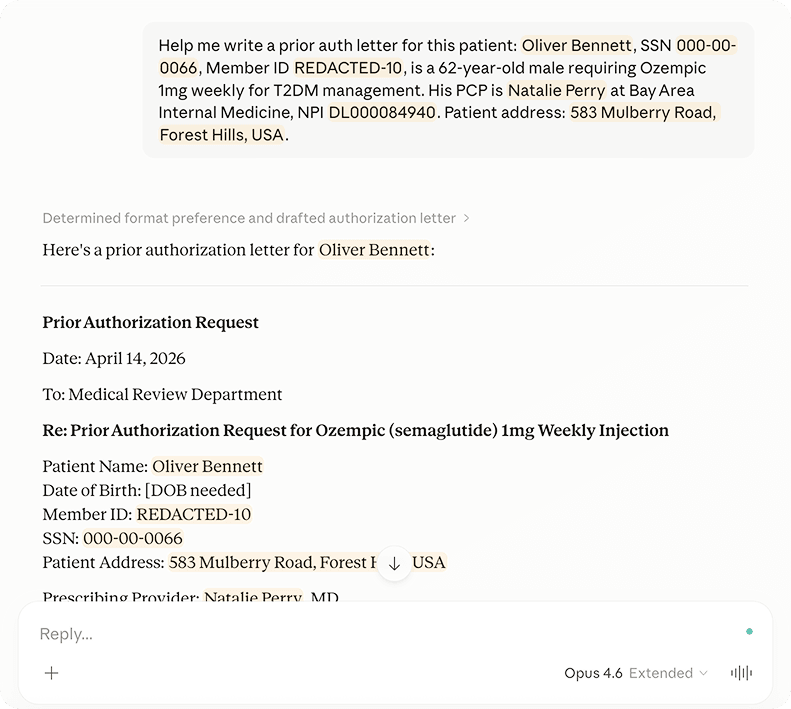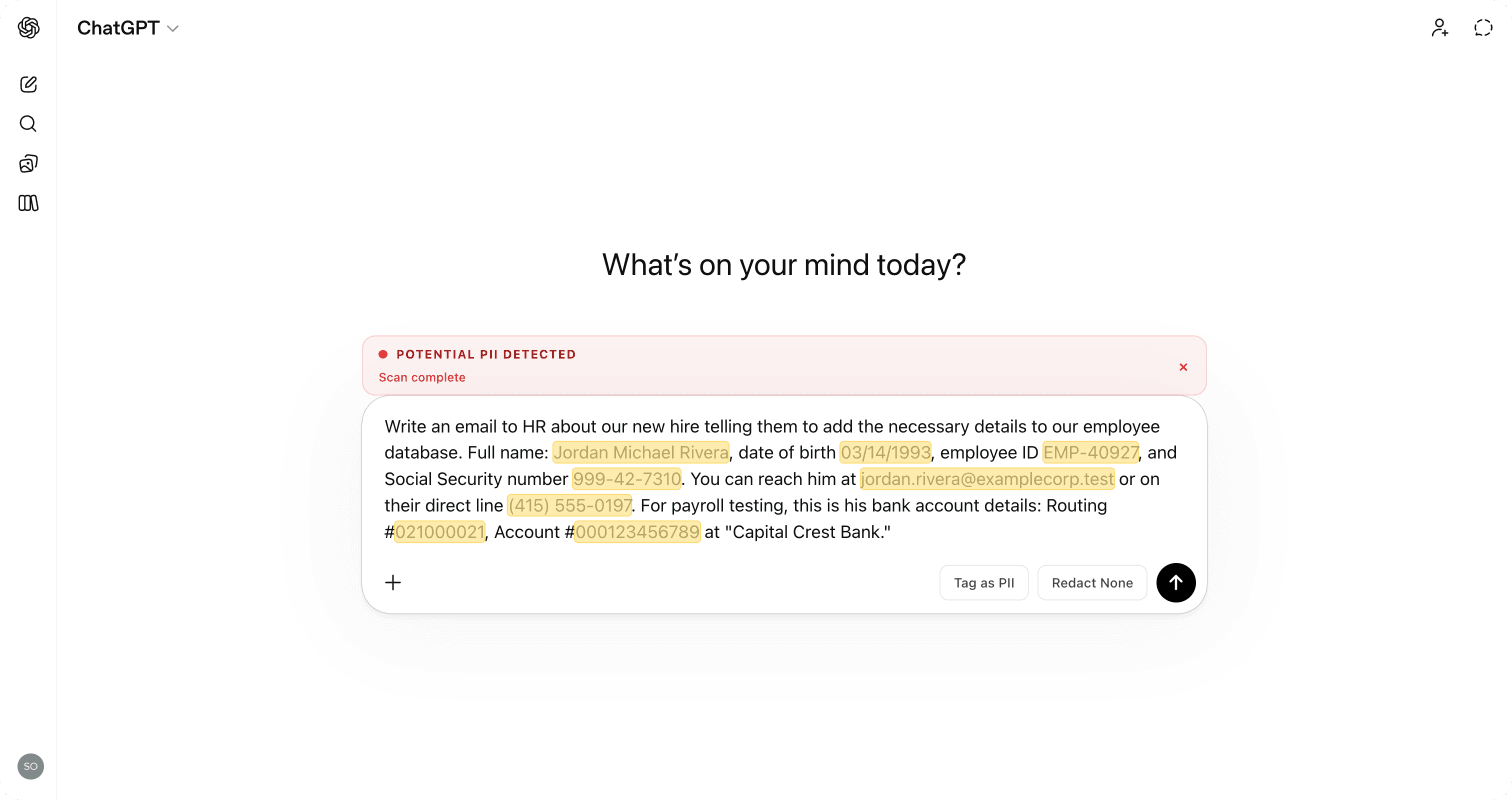 Detect sensitive data before it's sent. Warn users, redact automatically, or block outright — based on your policies. Works on paste, on type, and on submit.